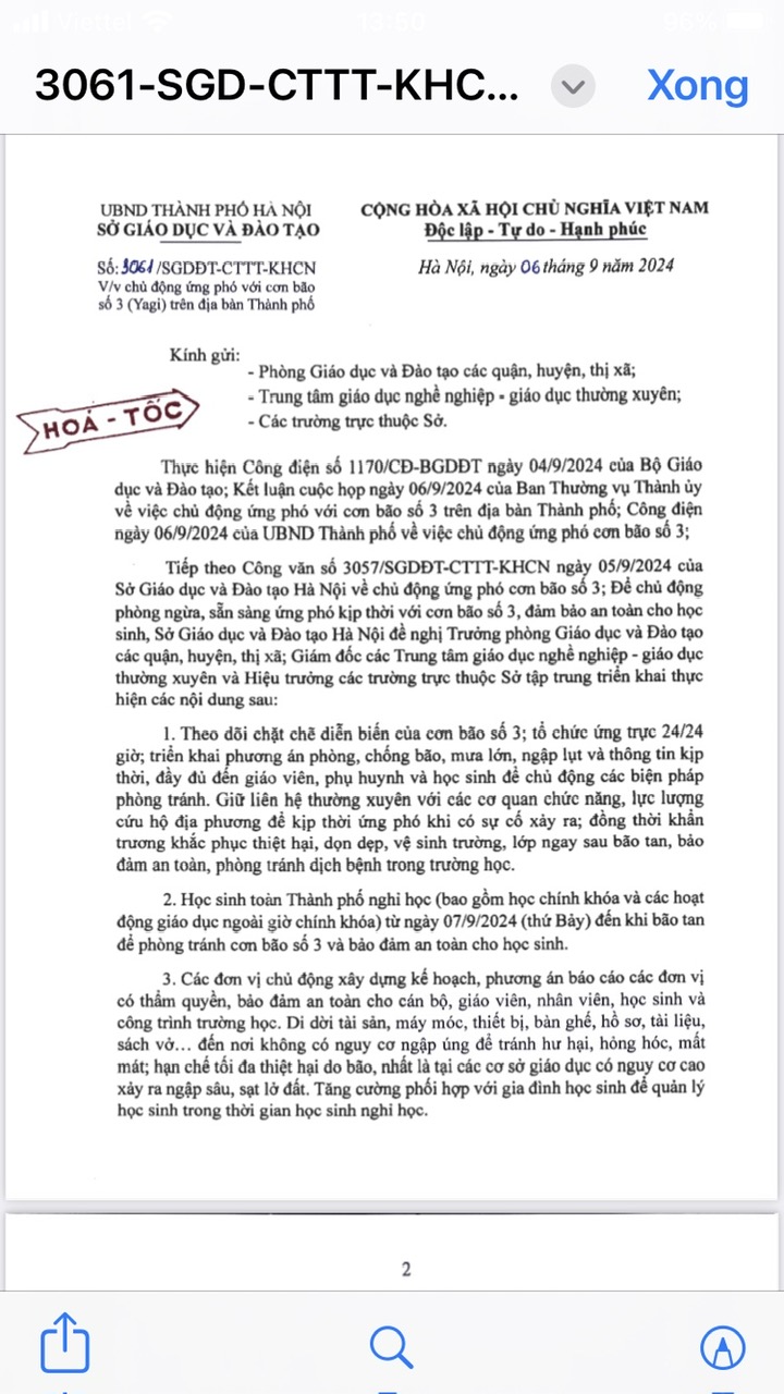 Thực hiện công điện số 3057/SGDĐT - CTTT-KHCN ngày 5/9/2024 của Sở GDĐT Hà Nội về việc chủ động ứng phó với cơn bão số 3 sẽ vào đất liền các ngày 6,7,8/9/2024, trường THCS Hữu Hoà xây dựng kế hoạch, kịp thời triển khai thông báo của Sở, chỉ đạo các bộ phận giám thị, đoàn đội, lực lượng thanh niên chi đoàn, GVCN... để rà soát đảm bảo an ninh an toàn trong nhà trường. Ban giám hiệu thường xuyên cập nhật các thông tin tình hình của cơn bão để phổ biến tới toàn thể cán bộ giáo viên nhân viên, học sinh.